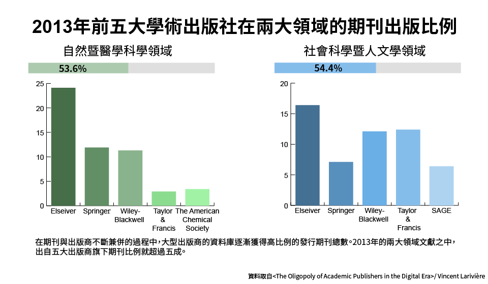 數位科技的應用,非但沒有使得知識的傳播更加普及與自由,反而讓大型的商業出版集團獲利更多。在自然暨醫學科學領域,1973年之前,前五大只佔該領域約20%的論文出版比例,到了2013年激增到53%,其中Reed-Elsevier、 Springer和 Wiley-Blackwell三家就囊括了47%的比例,足見出版比例分配的不均。社會科學暨人文學領域,1973至1990年間,前五大商業出版商所出版的論文比例佔該領域不到10%,卻在2013年時飆升至51%。換句話說,在這兩個領域做研究的學者在查詢資料時,大概每兩篇文獻,就會有一篇名列於這六大家出版商的資料庫之中(圖1)。