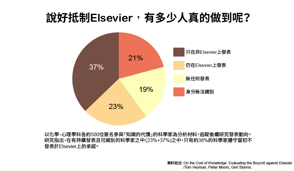 儘管Gowers的登高一呼獲得熱烈迴響,但這場杯葛似乎缺乏後續的威力與參與動能。根據Tom Heyman等人於2016年追蹤化學、心理領域約500名參與聯署的科學家後續動向的研究指出,有23%簽名的科學家仍在Elsevier發表論文(圖2)。對科學家來說,要遵守「不發表」的承諾所必須付出的代價不小,面對學術工作環境崇尚的高影響力指標,科學家常有投稿主流且高影響力期刊的壓力與誘惑。